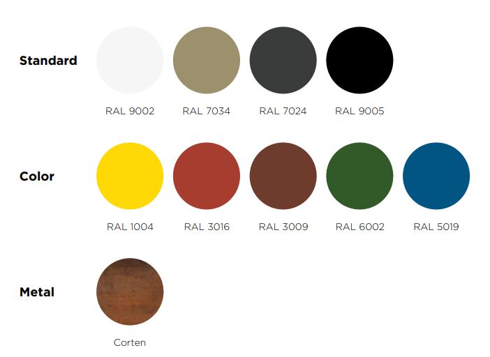 Gėlinė pagaminta iš 3 mm cinkuoto plieno lakšto, dažyto milteliniu būdu poliesterio dažais (80 mikronų, ISO 2630) arba cor-ten plieno.