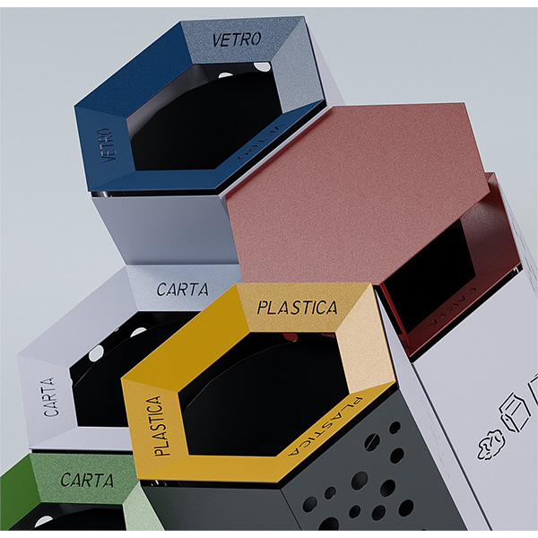 Viršuje dangtis įmituojantis bičių korio formą, atsidaro kad išimti šiukšlių kibirą.