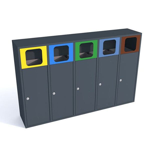 Atliekų rūšiavimo šiukšliadėžė pagaminta iš plieno, cinkuoto, dažyto milteliniu būdu pagal RAL paletę, arba iš nerūdijančio plieno.