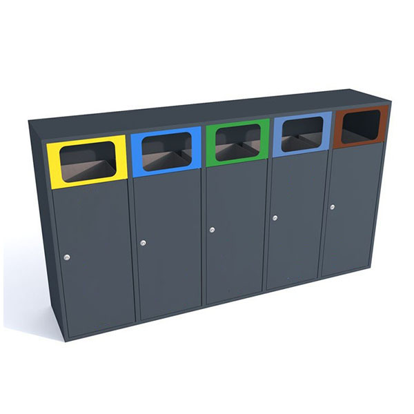 Atliekų rūšiavimo šiukšliadėžė pagaminta iš plieno, cinkuoto, dažyto milteliniu būdu pagal RAL paletę, arba iš nerūdijančio plieno.